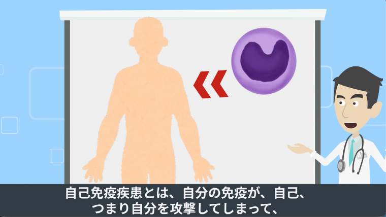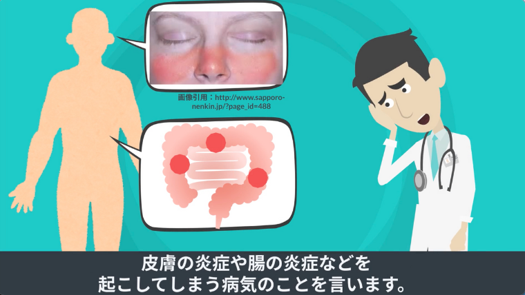 自己免疫疾患とは、自分の免疫が、自己、つまり自分を攻撃してしまい、皮膚の炎症や腸の炎症などを起こしてしまう病気のことを言います。