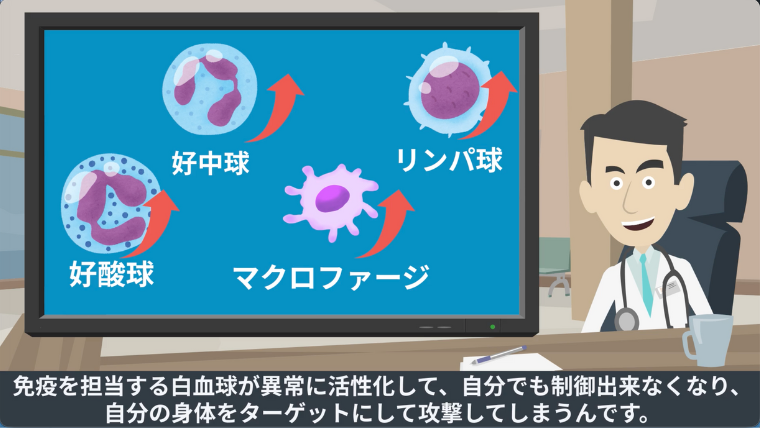 自己免疫疾患では、免疫を担当する白血球が異常に活性化して、自分でも制御出来なくなり、自分の身体をターゲットにして攻撃してしまいます。