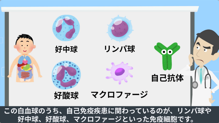 この白血球のうち、自己免疫疾患に関わっているのが、リンパ球や好中球、好酸球、マクロファージといった免疫細胞です。