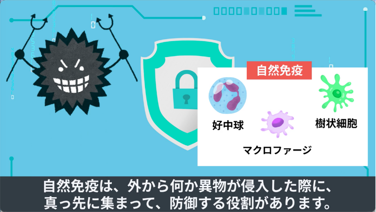 自然免疫は、外から何か異物が侵入した際に、真っ先に集まって、防御する役割があります。