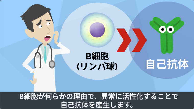 B細胞が何らかの理由で、異常に活性化することで自己抗体を産生します。