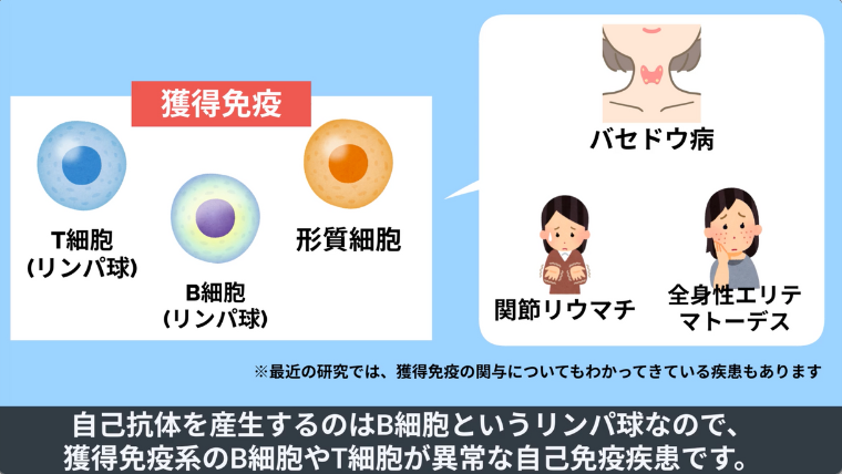 自己抗体を産生するのはB細胞というリンパ球なので、獲得免疫系のB細胞やT細胞が異常な自己免疫疾患です。