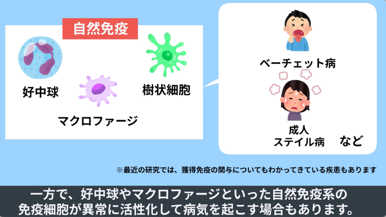例えば、ベーチェット病や成人スティル病といった病気は、主に自然免疫系の細胞の異常がわかっています。