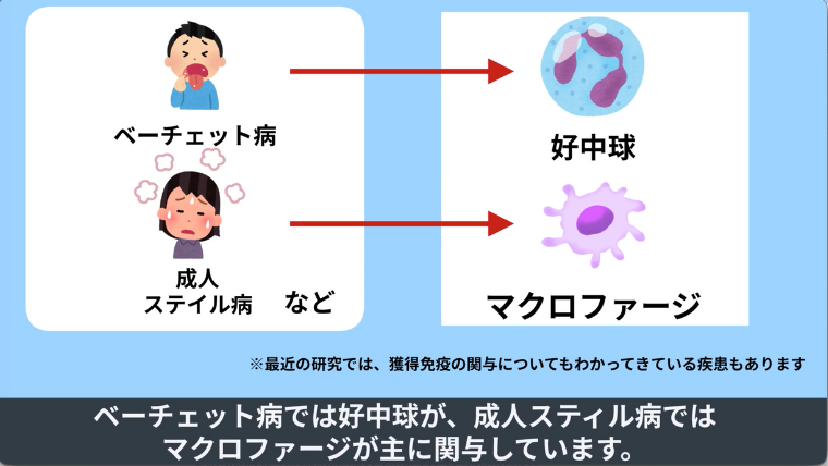 ベーチェット病では好中球が、成人スティル病ではマクロファージが主に関与しています。