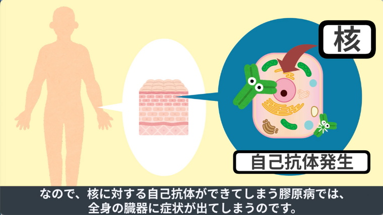 なので、核に対する自己抗体ができてしまう膠原病では、全身の臓器に症状が出てしまうのです。