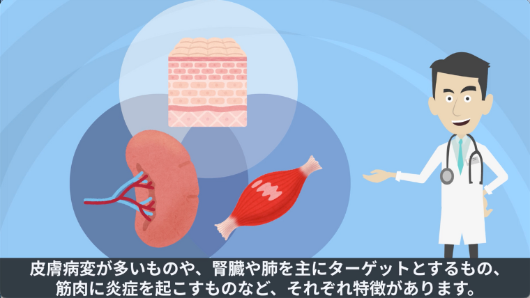 皮膚病変が多いものや、腎臓や肺を主にターゲットとするもの、筋肉に炎症を起こすものなど、それぞれ特徴があります。