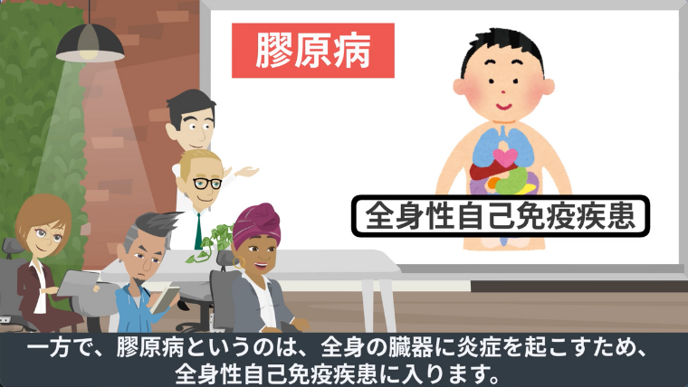 一方で、膠原病というのは、全身の臓器に炎症を起こすため、『全身性自己免疫疾患』に入ります。