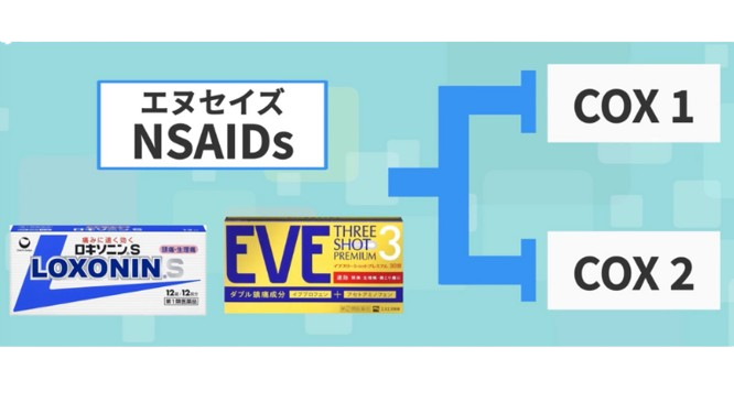 薬によって効き方に違いはありますが、このCOX1と2の両方を阻害するのがNSAIDsの代表的な作用です。