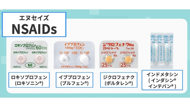 実は「 NSAIDs 」は身近な薬のカテゴリーで、ロキソプロフェン、イブプロフェンといった市販薬にも多く存在しています。