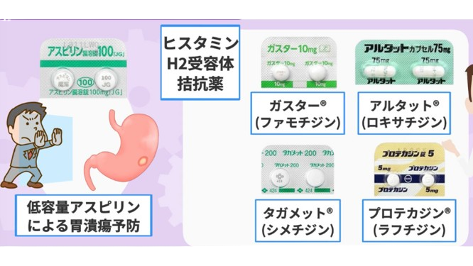 低用量アスピリンによる胃潰瘍予防に限れば ヒスタミンH2受容体拮抗薬(ガスター®︎ ザンタック®︎、タガメット®︎、プロテカジン®︎など)という胃薬も使われることがあります。