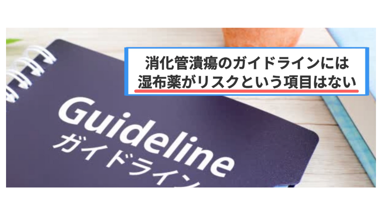 しかし、一例の報告を散見する程度であり、消化管性潰瘍のガイドラインにも湿布薬がリスクであるという項目はありません。