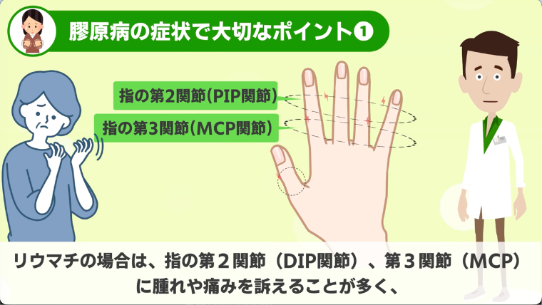 リウマチの場合は、指の第2関節(DIP関節)、第3関節(MCP)に腫れや痛みを訴えることが多く、