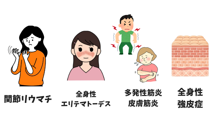 膠原病は、全身性の自己免疫疾患の総称ですが、さらに関節リウマチや全身性エリテマトーデスなどといった疾患に分かれます。